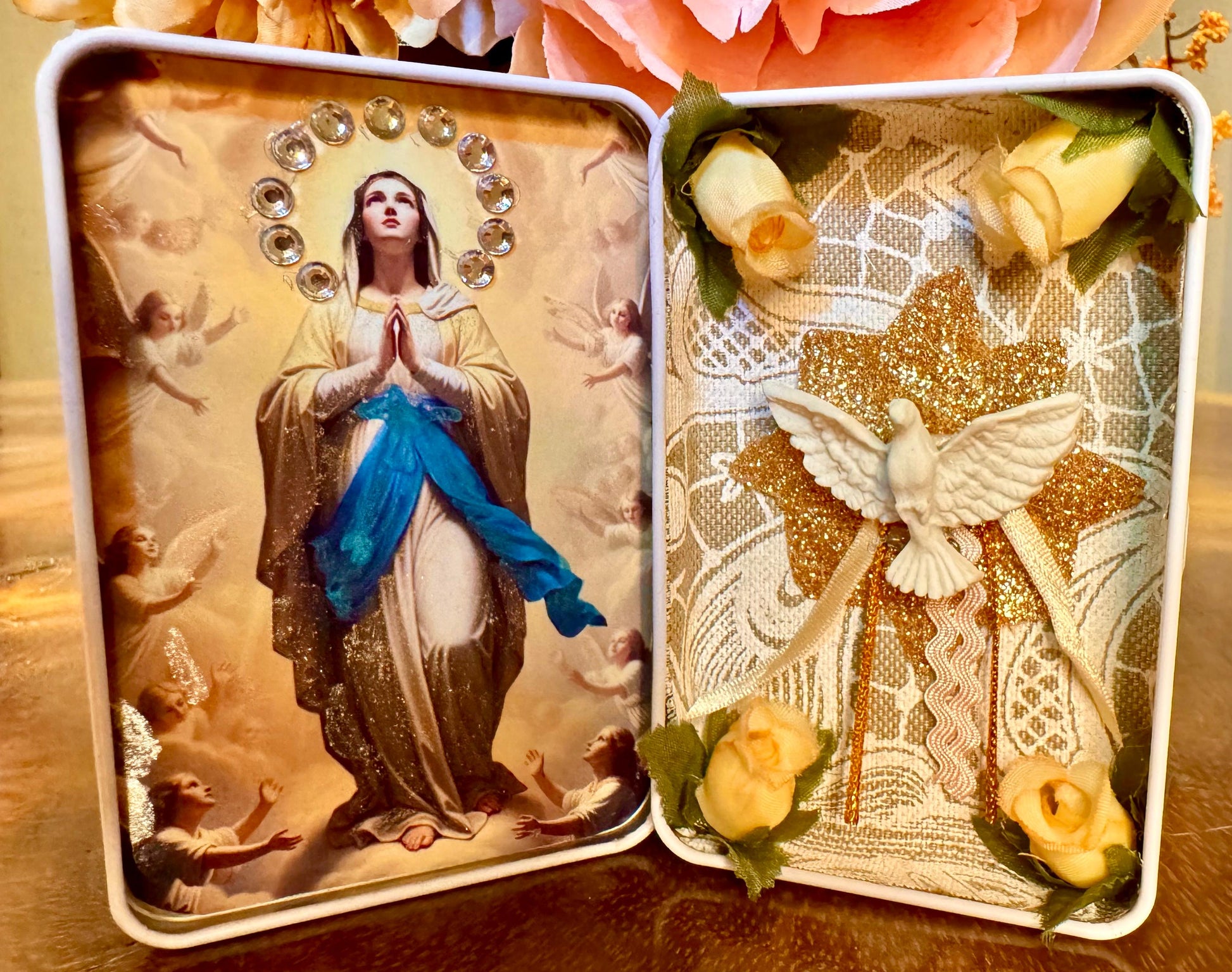 • Portable, Versatile, and Meaningful: Embrace the serenity and beauty of our Mini Shrine tin box – a small yet powerful token of faith and connection.