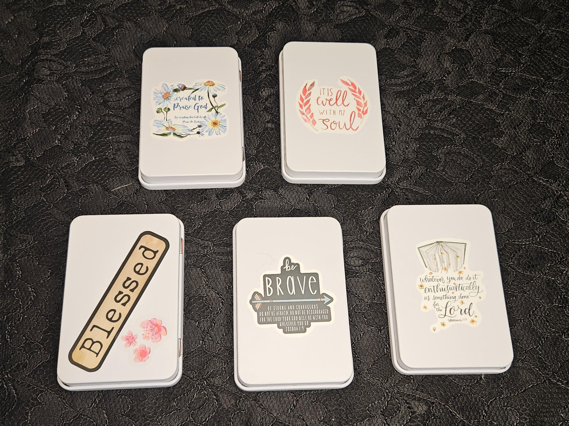 Tin Box crafted ,lined with cotton fabric , decorated with washi tape stickers, flowes,randon frases of faith and nature.
