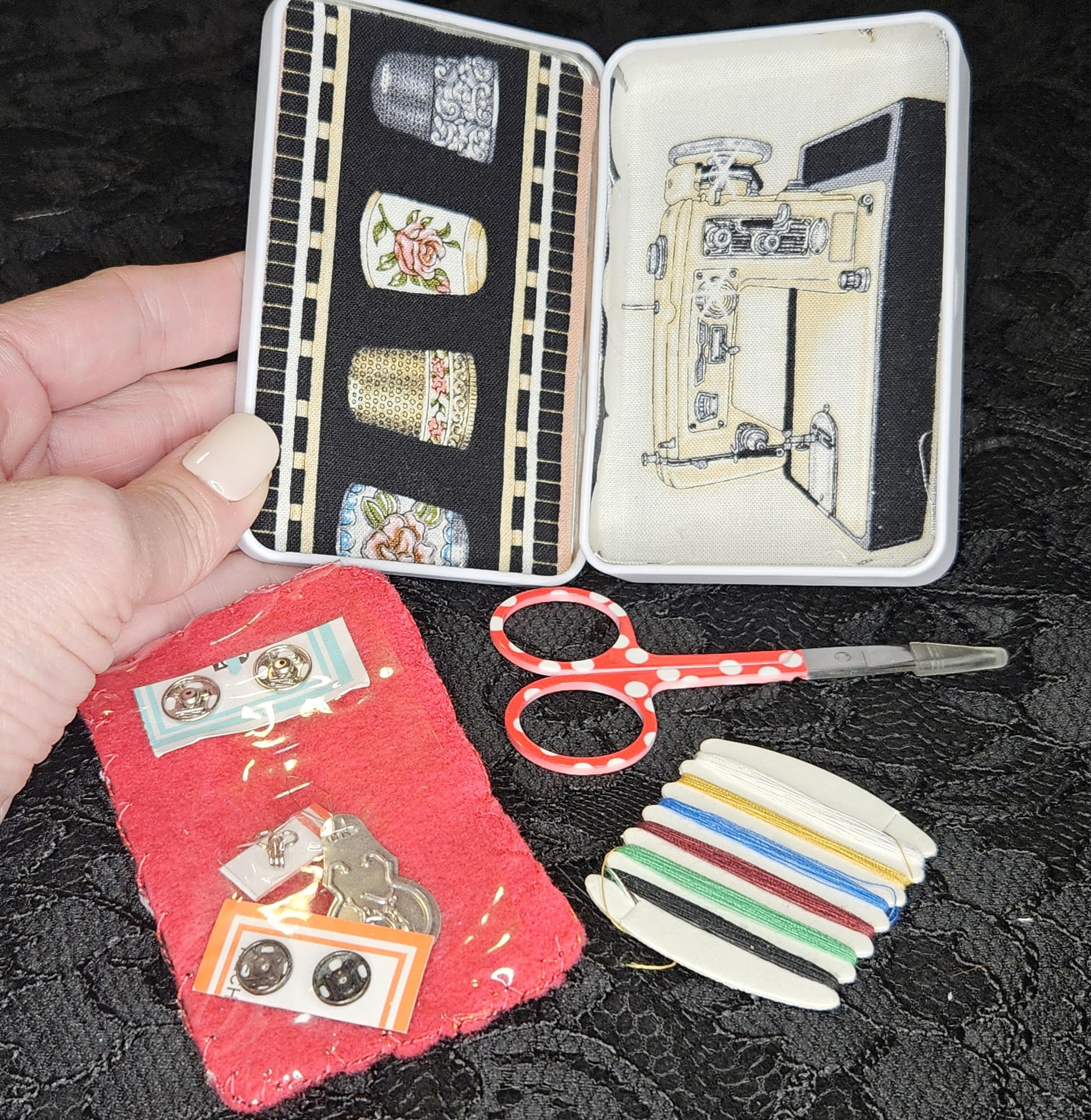 Contain one small scissor,colored threads, random size buttons, hooks, pression hooks, needles, pins, threader. The material may vary in color shape or size.
