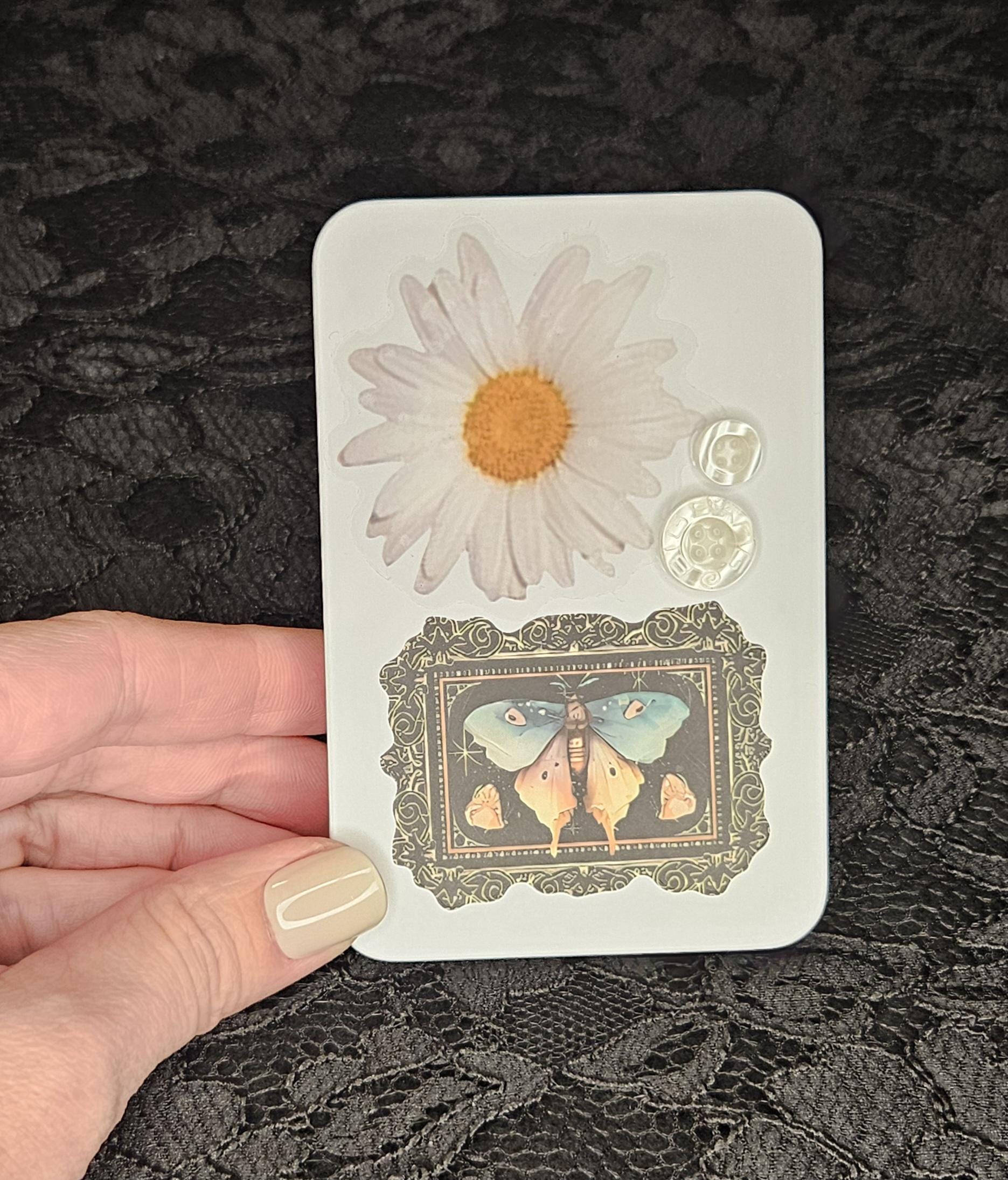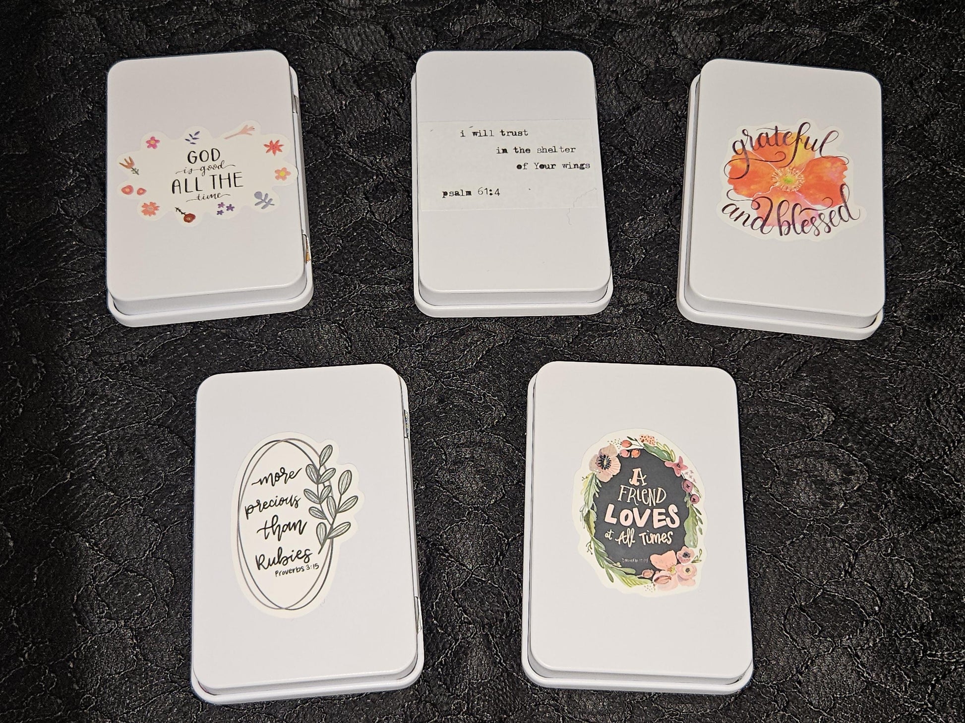 Tin Box crafted ,lined with cotton fabric , decorated with washi tape stickers, flowes,randon frases of faith and nature.
