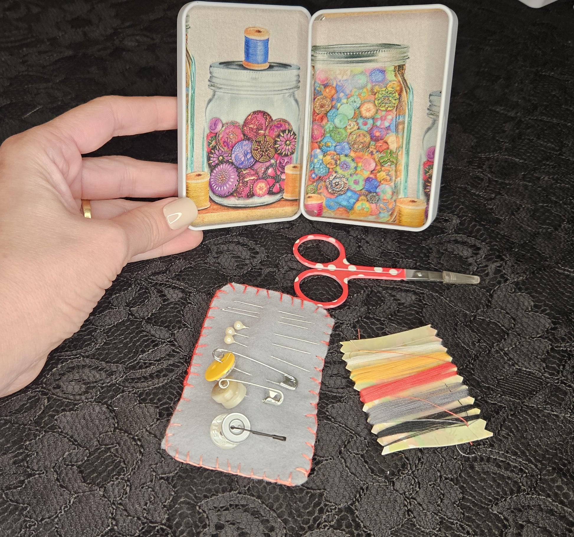 Contain one small scissor,colored threads, random size buttons, hooks, pression hooks, needles, pins, threader. The material may vary in color shape or size.
